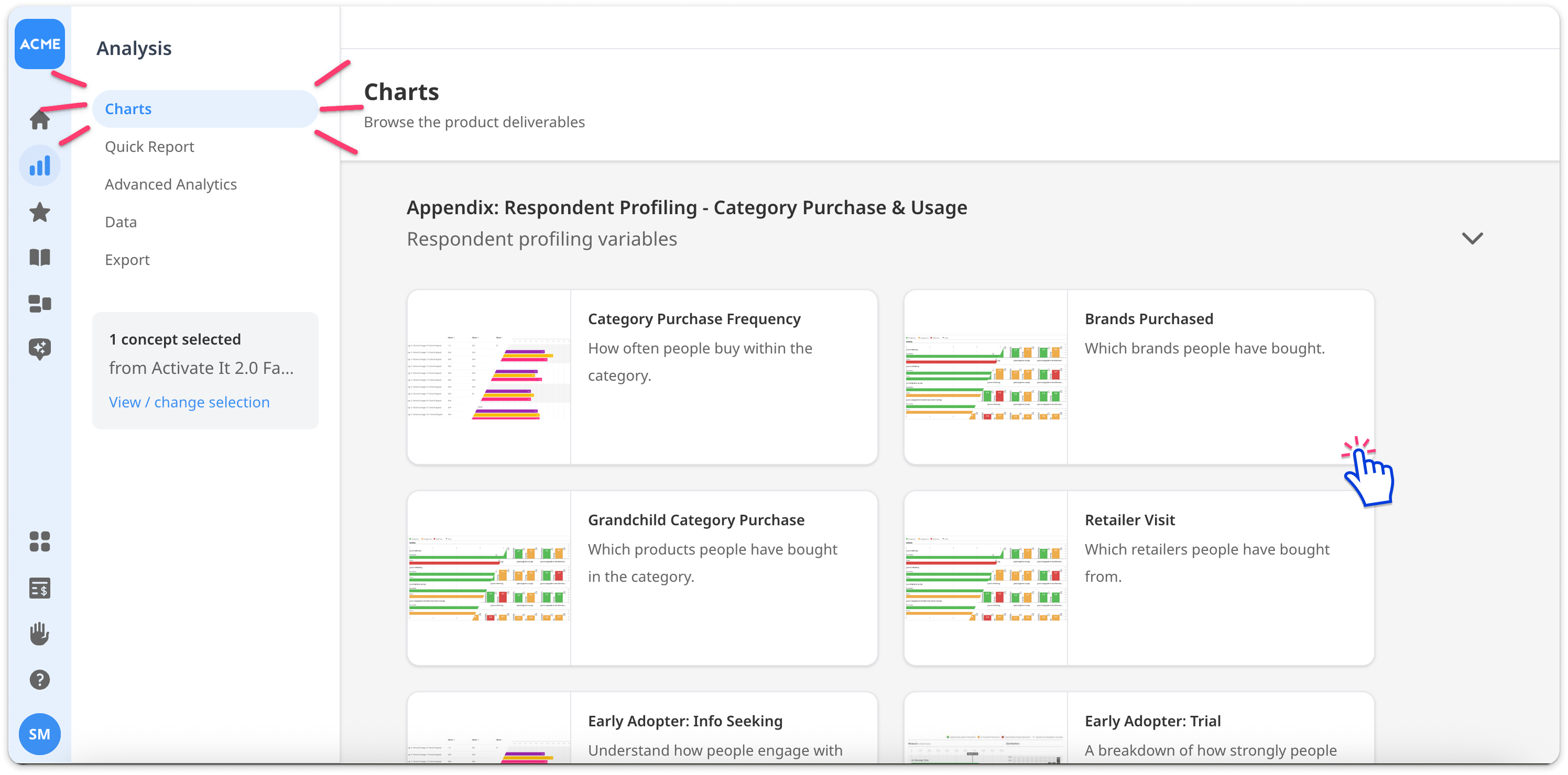 2. Select the Charts tab from the left menu. you can browse a selection of charts, each accompanied by a brief description explaining its insights. Select the chart you’re interested in.
