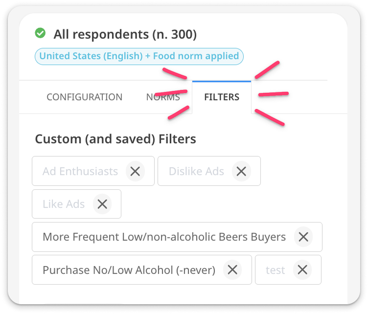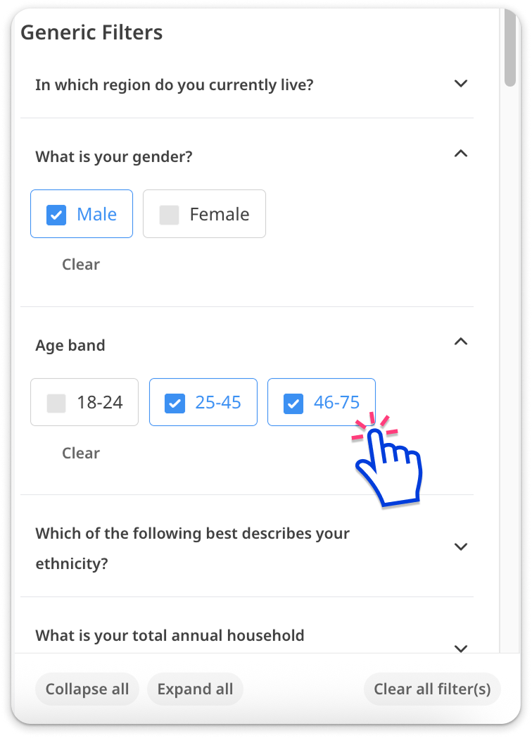 4. Explore your filters! The available options will depend on which tool you've used and what custom questions you included. Generally speaking, the first filters listed are from the survey's screening portion, followed by measures or attitudes asked for in the main survey, followed by your custom questions. Expand the filter you'd like to apply and select options to include in your analysis.