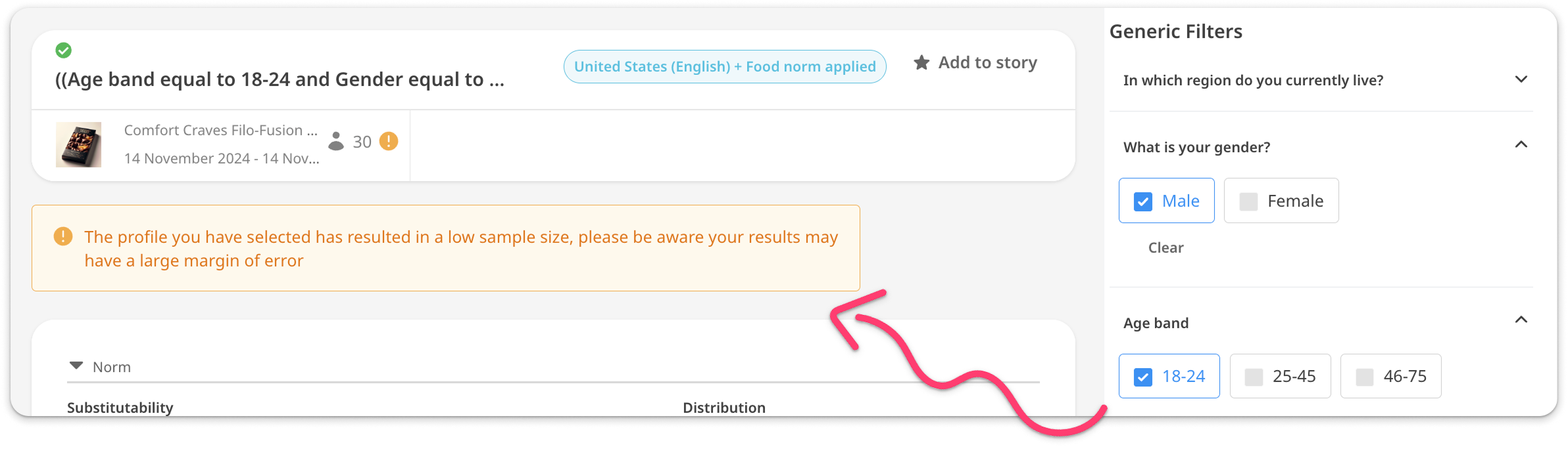 As you adjust your filters, the base size reflected in your analysis will drop. Take caution with conclusions drawn based on small numbers of people.