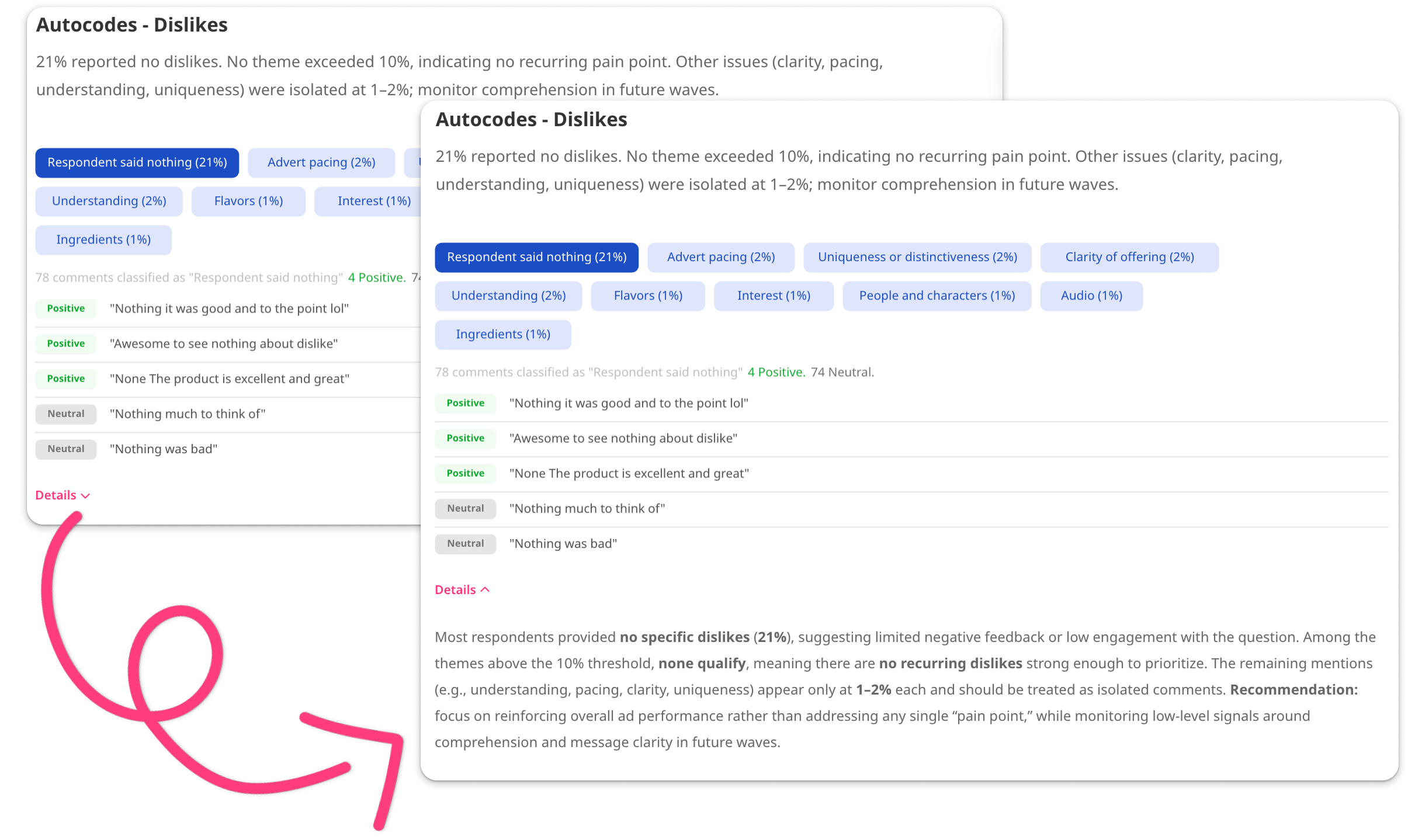 Zappi’s AI-powered verbatim analysis extracts meaningful insights from qualitative data while ensuring accurate, structured analysis. This feature automates the quantification of open ends by theming of responses from likes and dislikes, recall exercises, and assessing cultural sensitivity.