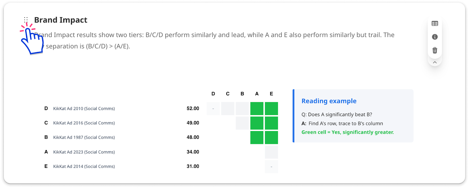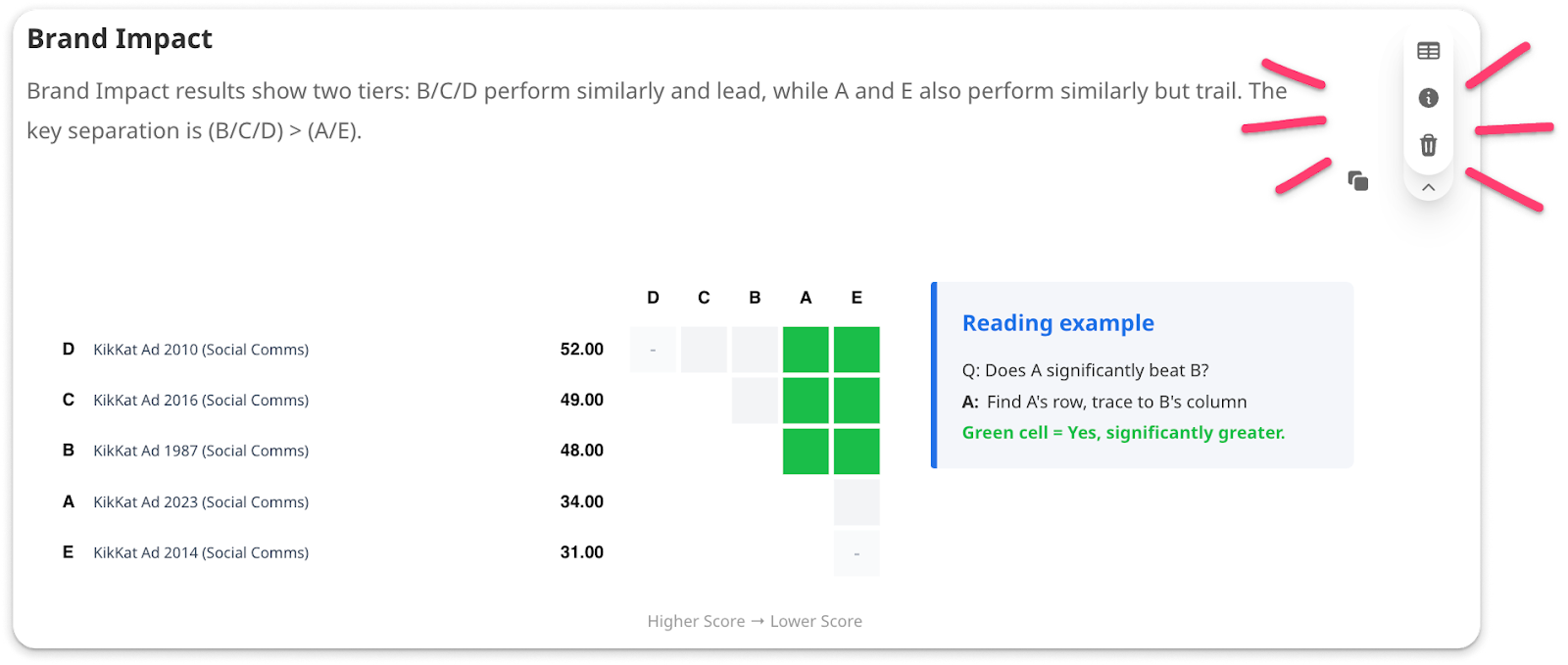 The strengths and weaknesses section is slightly different in cross-market analysis. Individual scores cannot be compared as they are relative to their own market, so we use norm/significance indicators instead via a traffic light system (green, amber, red). This system indicates significance against its normative comparison for the local market, while allowing studies from different markets to be compared against one another. Users can still view individual scores by hovering over each block for more detailed breakdown.