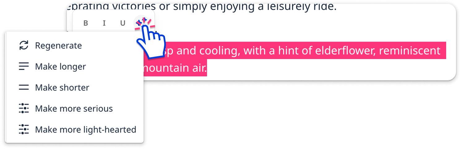 Highlight any text in a generated concept to access new AI editing options. Instantly rewrite selected content to: