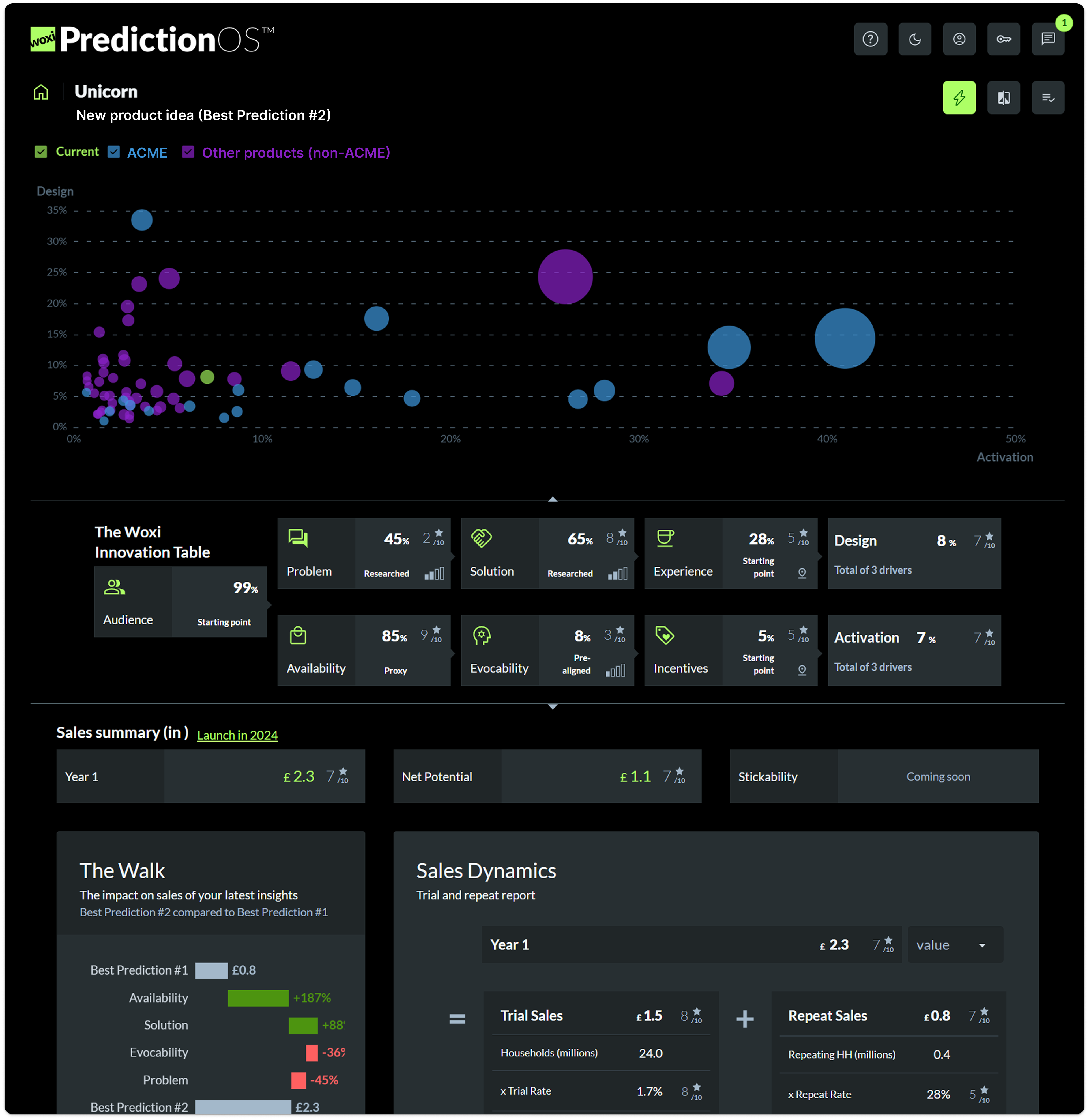 Zappi innovation research contains measures that directly impact sales. These are seamlessly fed into the Woxi platform and automatically mapped to the relevant driver of its prediction framework.