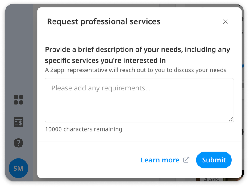 If you are an existing Zappi user, you can request services straight from the platform. Click on the hand icon on the left hand menu to ‘Request professional services (including consultancy)’. A form will appear where you can add a description of your requirements. Your customer representative or a consultant will be in touch to discuss further.