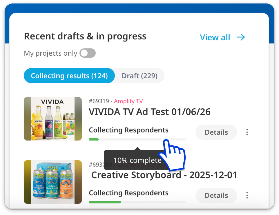 Once you’ve launched, you’ll see that your fieldwork now appears in the 'Recent Drafts and In Progress' section on the homepage. You’ll see some details on your project to help you identify it, and a percentage indication of overall progress when you hover over the progress bar.
