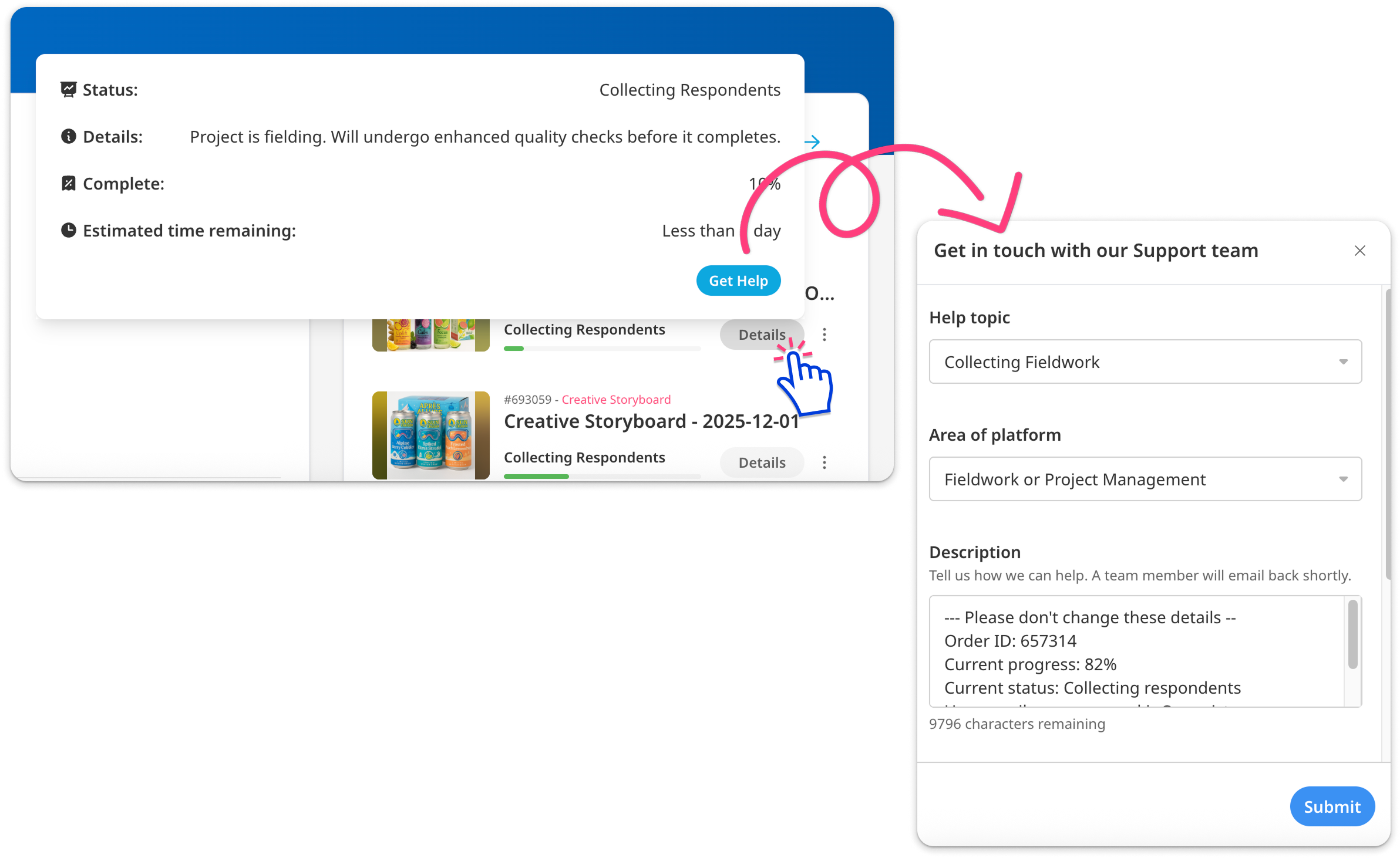 From here, you can also click the 'Get Help' button to open a support ticket. It will be pre-filled with current information about your fieldwork.