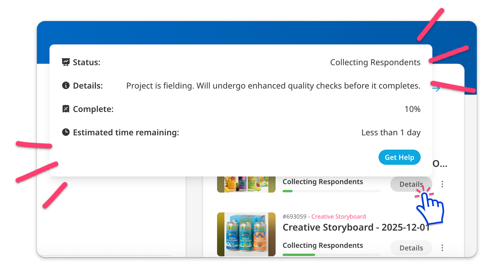 As your project collects respondents, the progress bar will update periodically to help you keep track of it. You can hover over it for a more detailed update.
