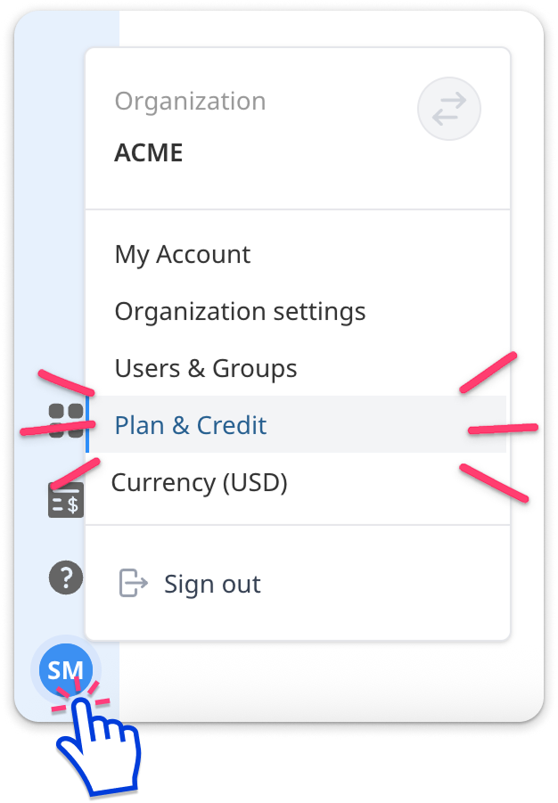 To see the wallets that you have access to in your account, click your avatar in the bottom left, then select ‘Plan and Credit’. You can see the amount of money and who has access to use each wallet.