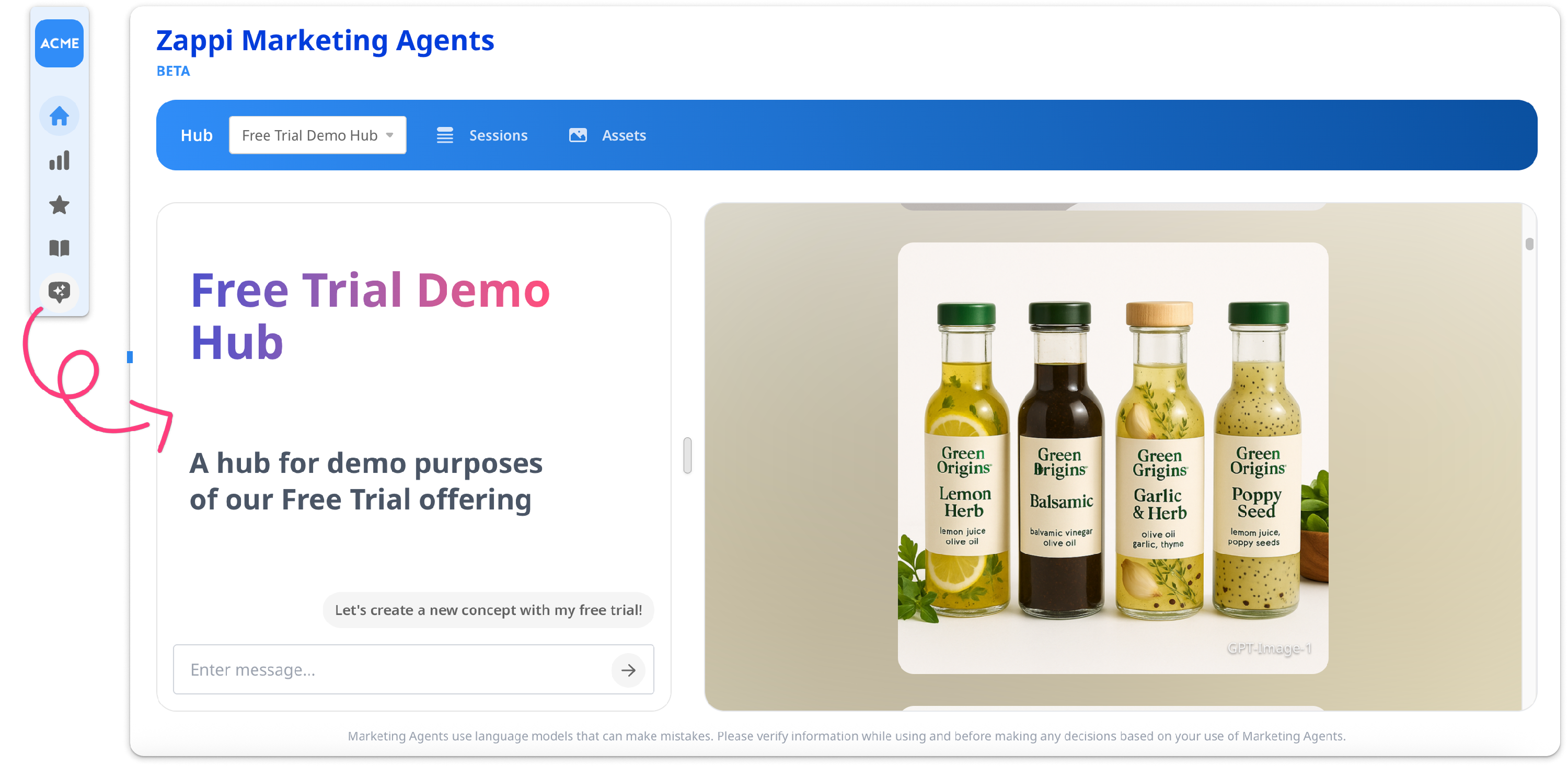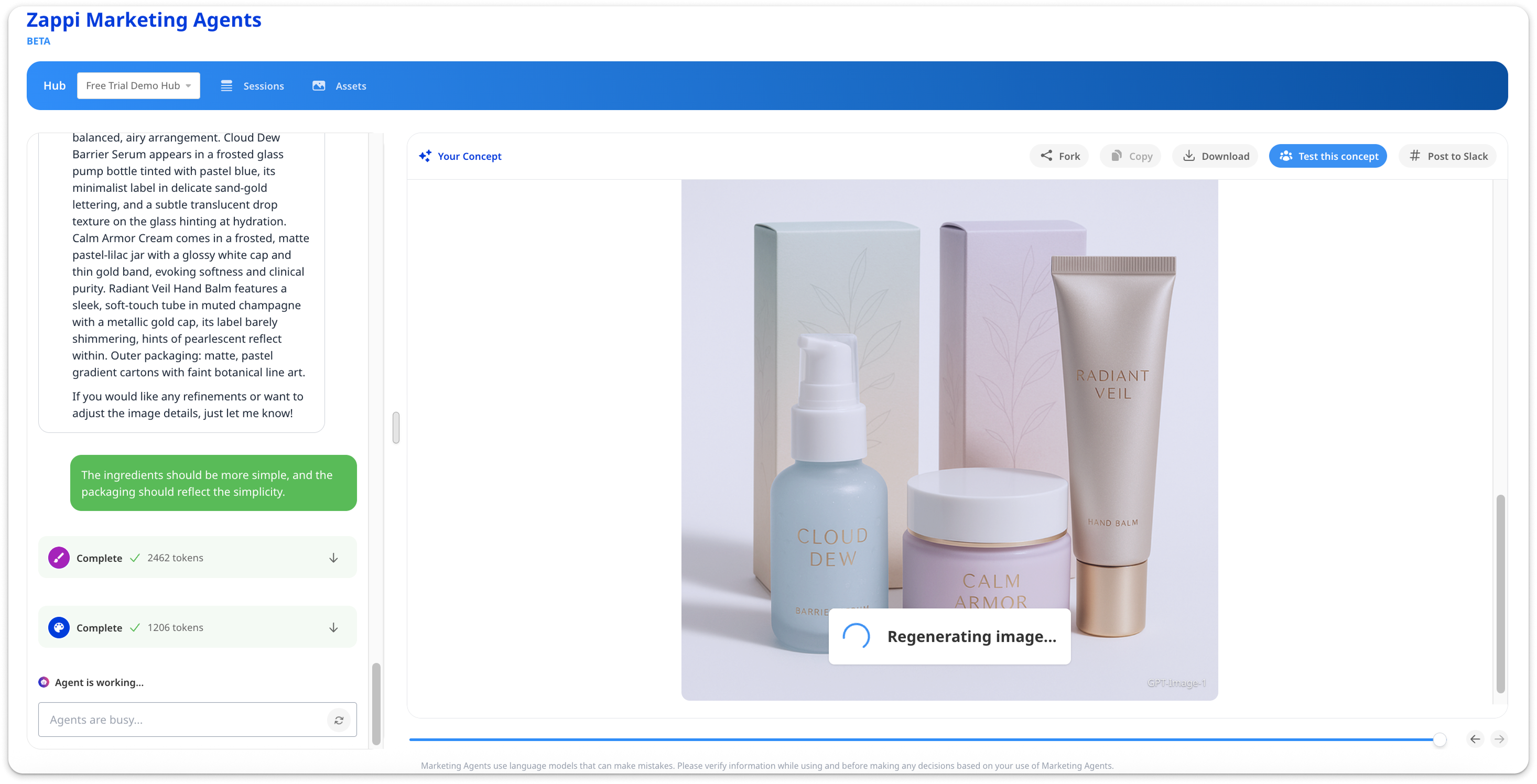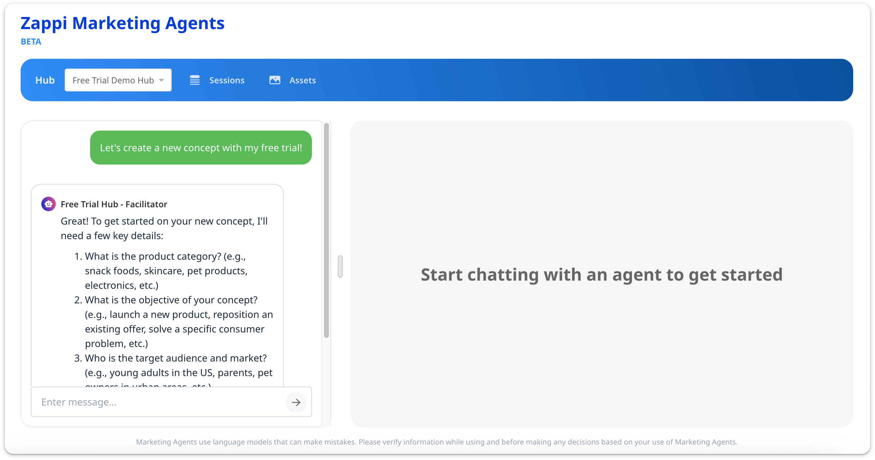 Important note: During the free trial, the agents will attempt to create something brand new, and do not have any customized brand inputs. With a paid subscription, Zappi will train a customized brand agent to ensure all of your concepts align with your brand goals.