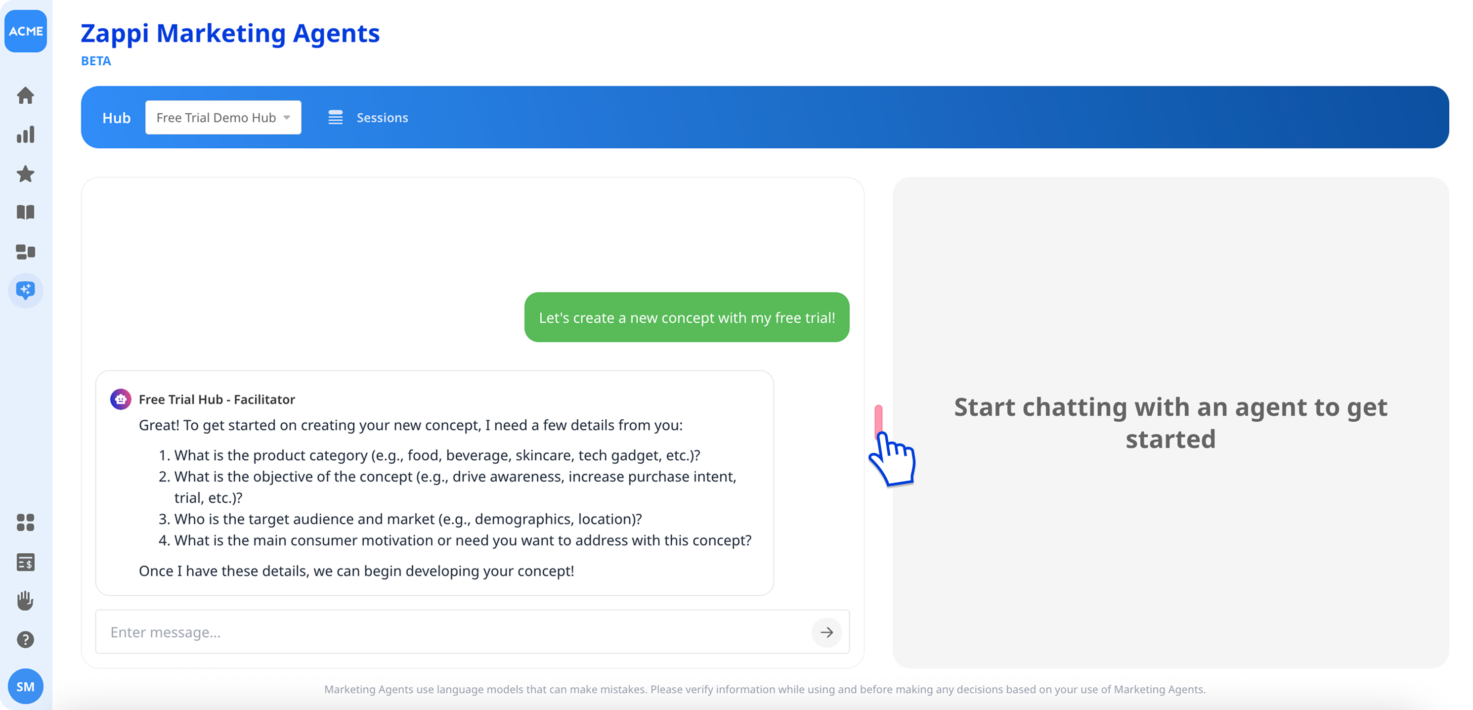 Once you have been granted access to the free trial, you can access the agents directly on the Zappi platform. Go to the side bar, and click on the ‘Marketing AgentsTM’ icon.