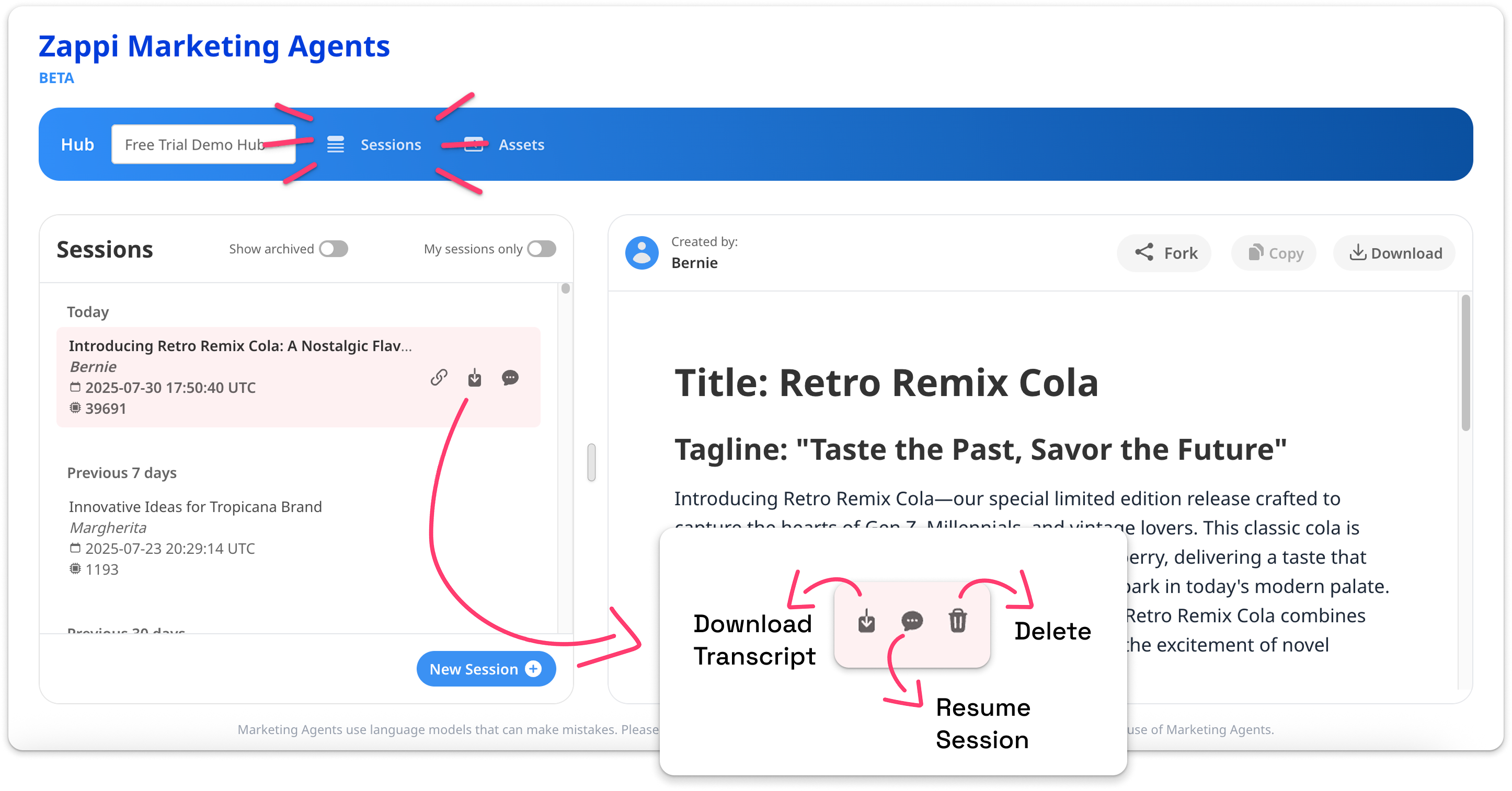 You can go back to a session and continue to iterate from where you left off. Click ‘Sessions’, find the session you want, and download the transcript, resume the session or delete the session if it’s your own.