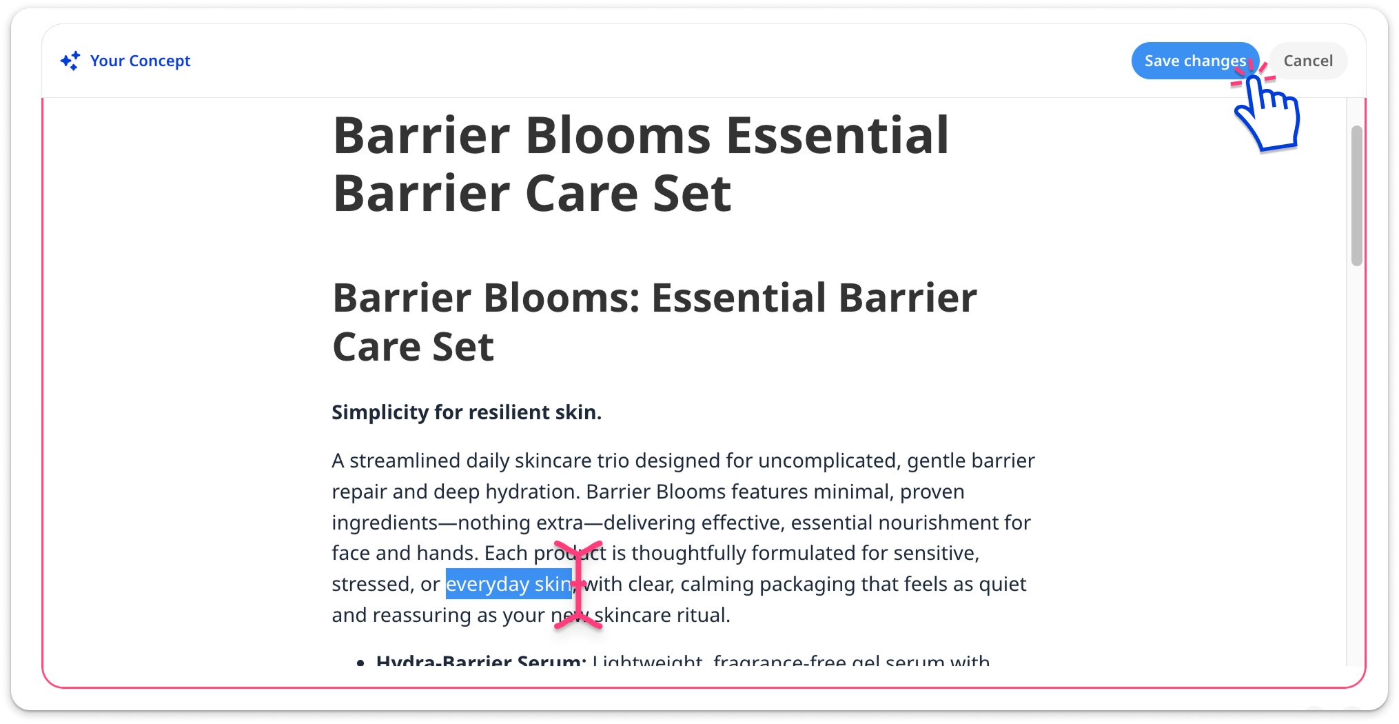 State your goal upfront. When you’re making adjustments, tell the agent your goal, and any details you want them to include to get there. | “The concept should be made of more expensive materials.” | “I want the concept to be a premium option. Update the concept to include more high end materials.” |