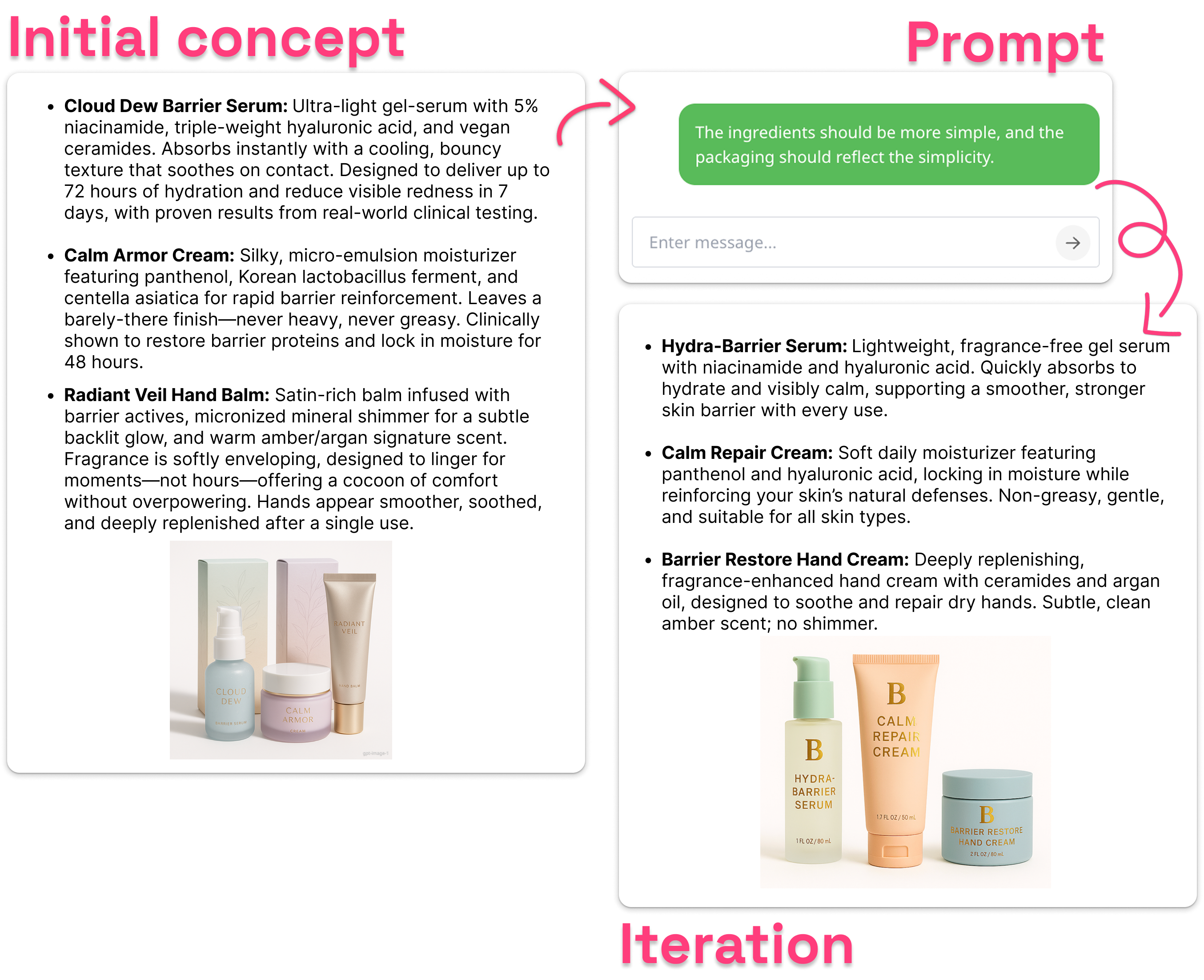 Iterate to refine your concept. Tell the agents what you want to keep or change. You can also give them guidance on how to change it. | "Change the ingredients list to include healthier options." | "I want to keep the flavor the same, but change the rest of the ingredients list to include healthier options like spinach and spirulina." |