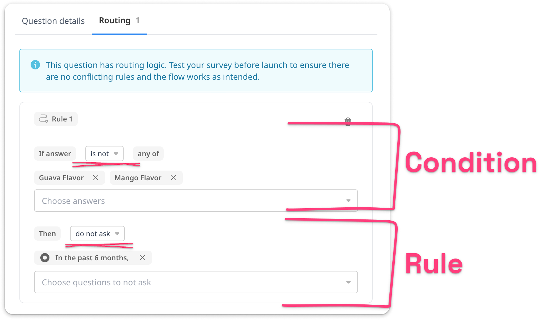 Ask Anything lets you completely customize a survey to get answers to nuanced questions. Rules can range from super simple, to very complex. Below are some scenarios to help you with complex routing.