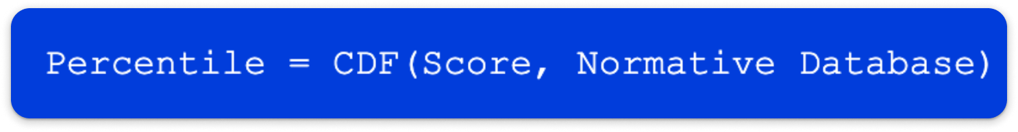 - The CDF percentile calculation provides an intuitive way to understand performance by showing where a stimulus ranks within the normative distribution of comparable tests.