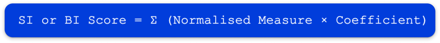 - The SI score is calculated once per respondent and is never recalculated. Transformations and coefficients are constants derived from historical data.