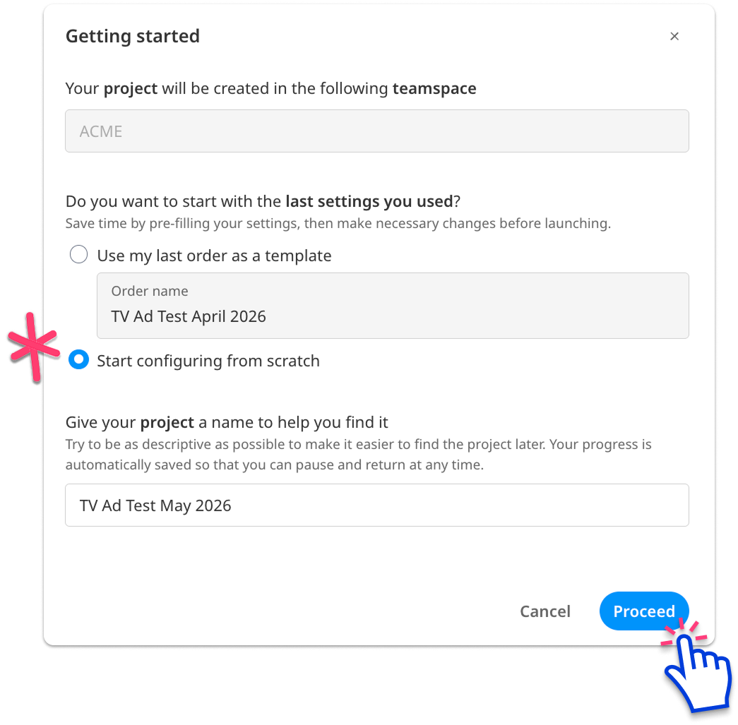 - Project Info - shows your sample size, total base price before any discounts are applied, and quickest estimated completion time.