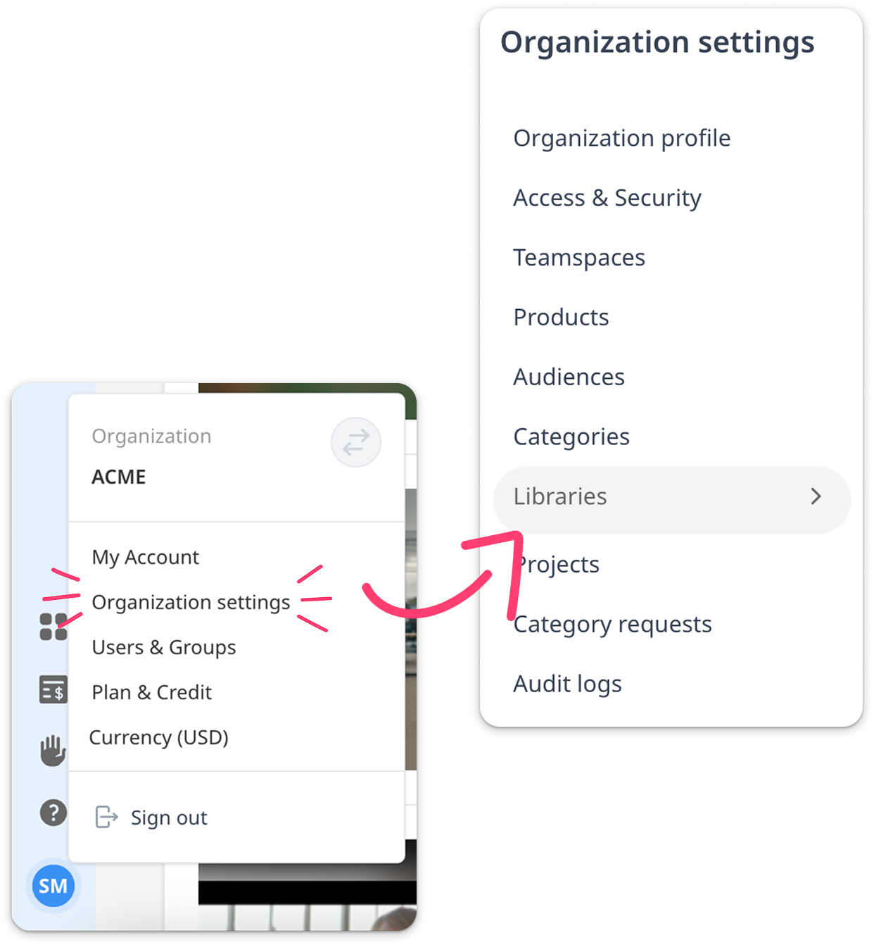 Click your avatar in the bottom left, then select 'Organization Settings' then select 'Libraries'.