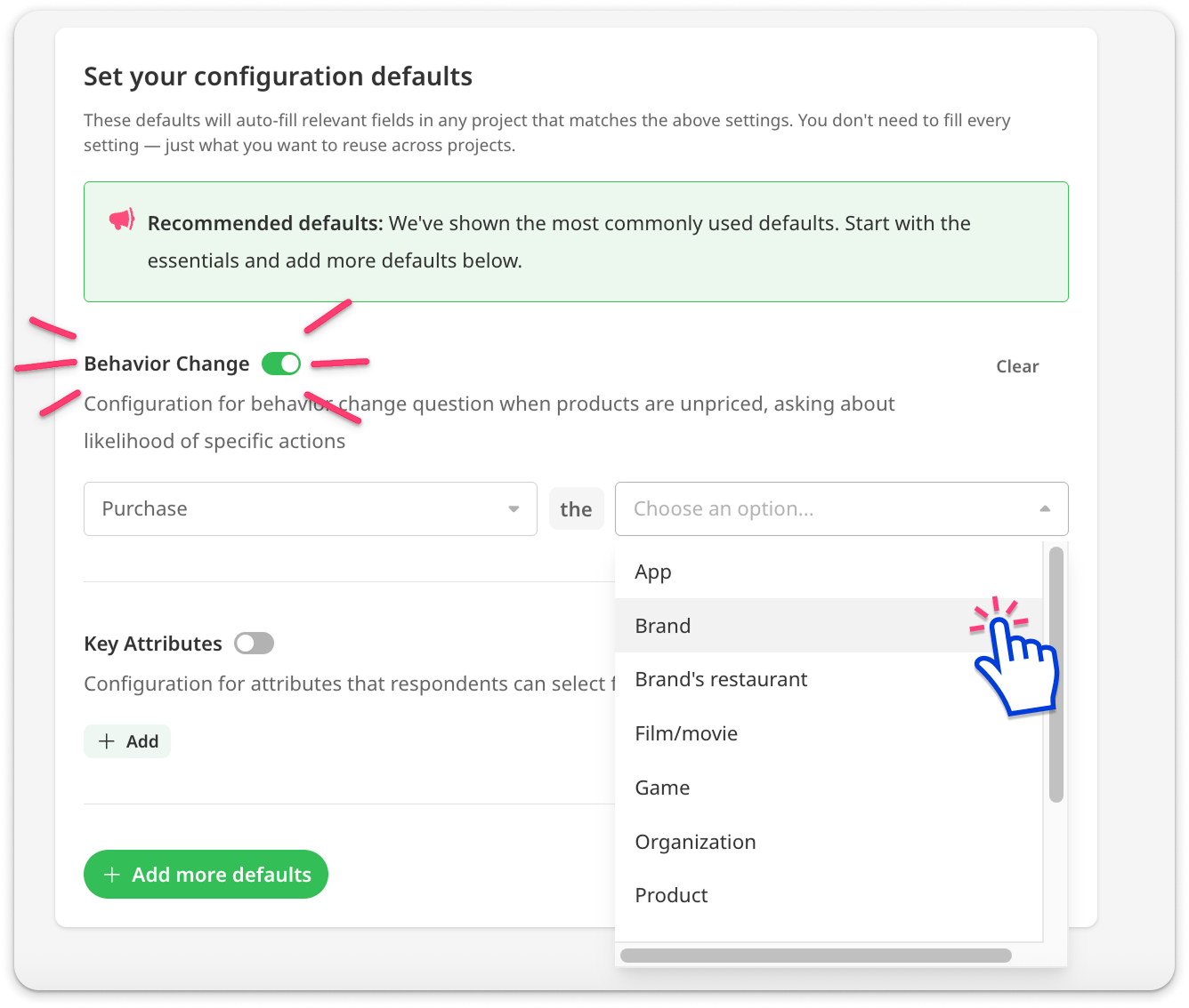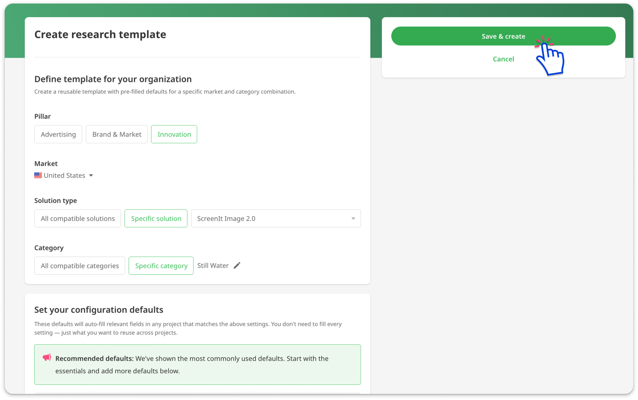The next time you set up a project that matches the solution, market, and category of your template, your default options will auto-fill for each stim.