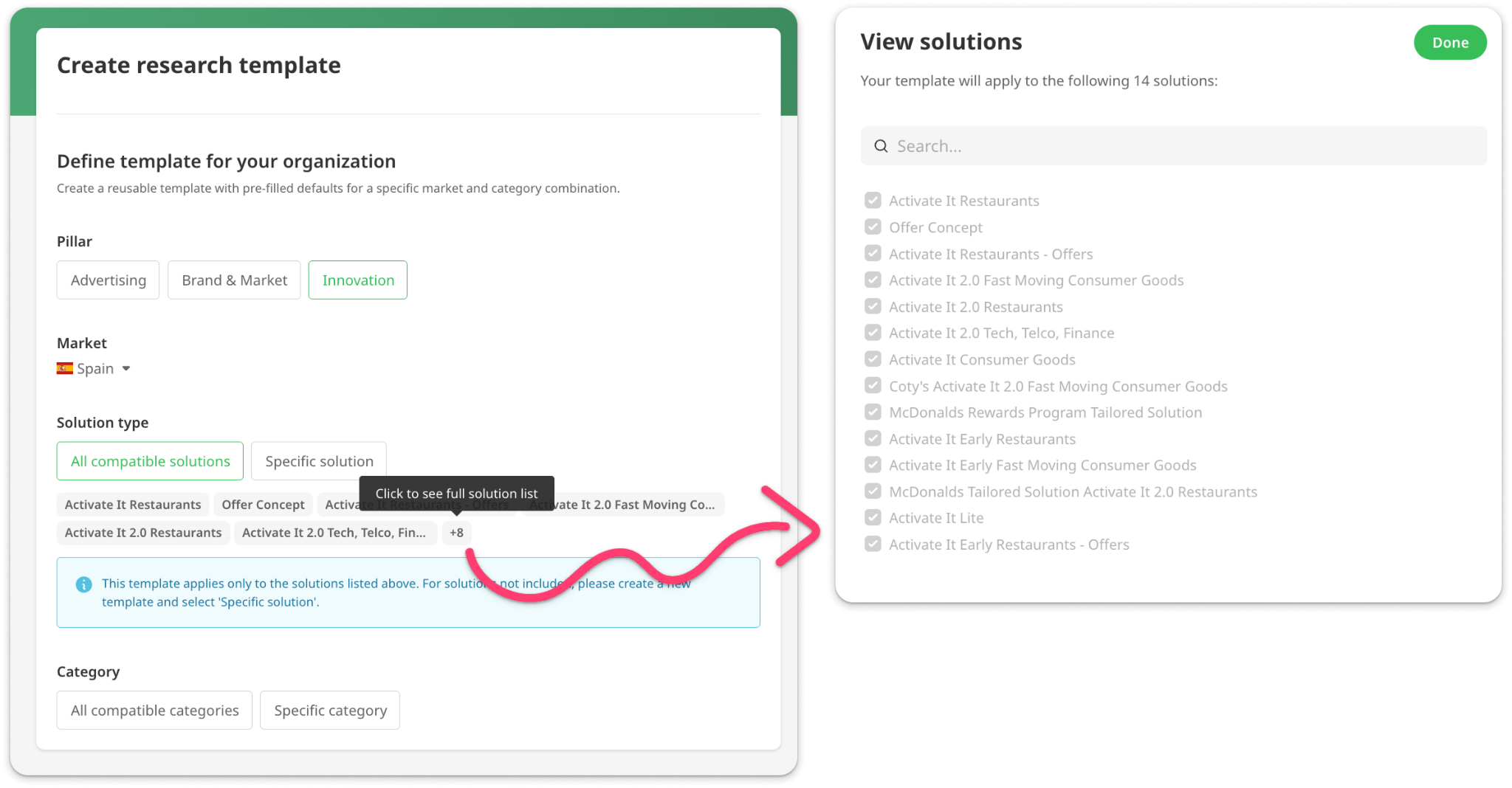 - This includes a list of solutions available to your domain that can be grouped together. This usually includes solutions like Amplify and Activate it that can use our latest category system. You may find that this list does not include all solutions you use. For any solutions not listed in this group, you will need to create a separate template for the individual solution.