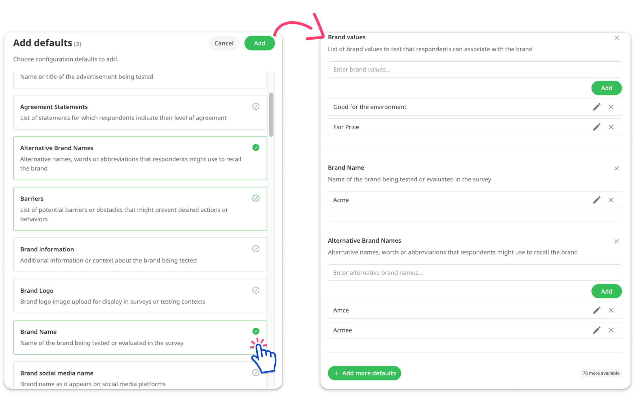 You can add as many defaults as you’d like. Click ‘Add more defaults’ and select them from the list. You can select multiple defaults at once.