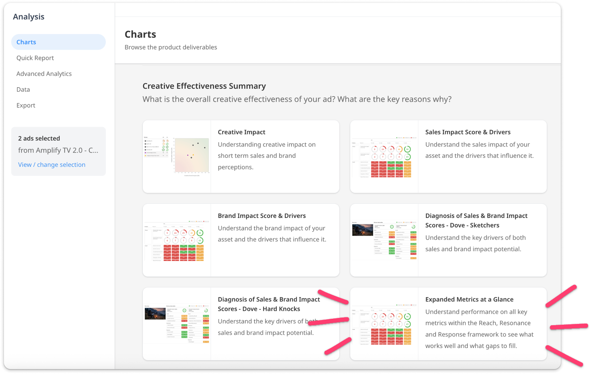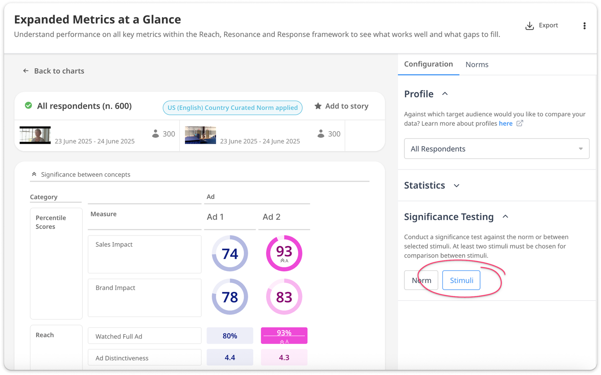 Charts default to comparing to the norm. To compare the ads to each other, go to the configuration settings on the right and under ‘Significance Testing’ select ‘Stimuli’