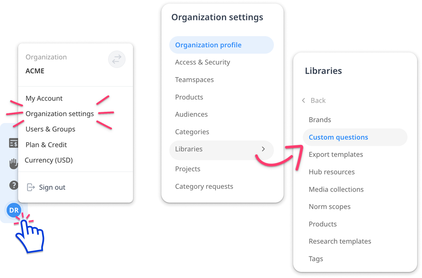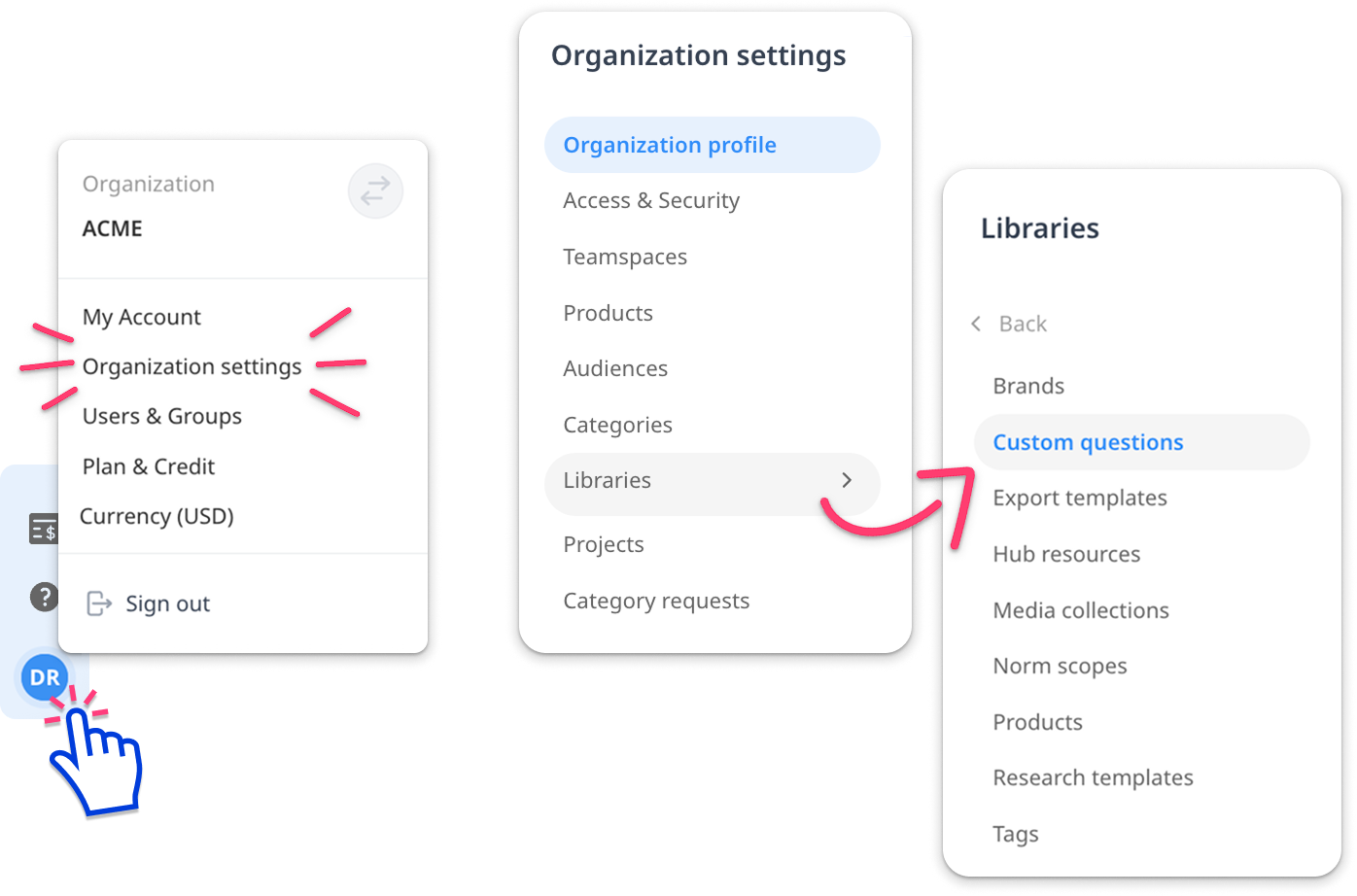 Navigate to the custom questions library by clicking your avatar in the bottom left and selecting 'Organization Settings'. Then select 'Library' and 'Custom Questions'.