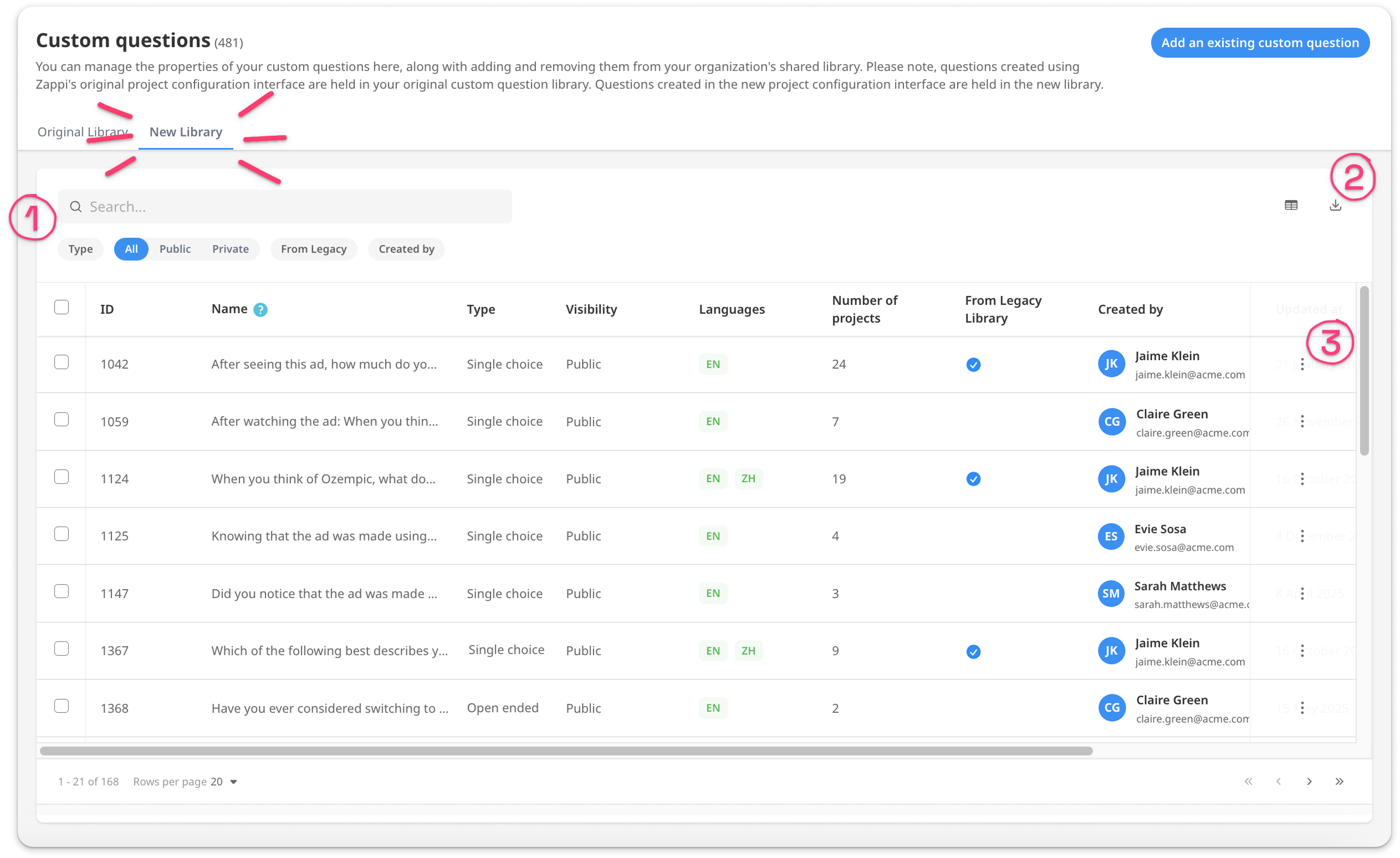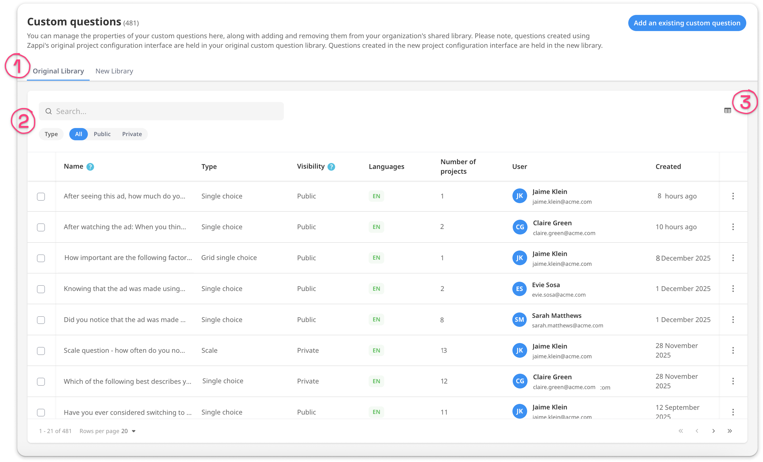 The Custom Questions Library lets you manage the questions your organization uses across your projects. Custom questions don't have to be a one and done, you can re-use the same question over and over and compare the results across multiple projects (for most Zappi Solutions).
