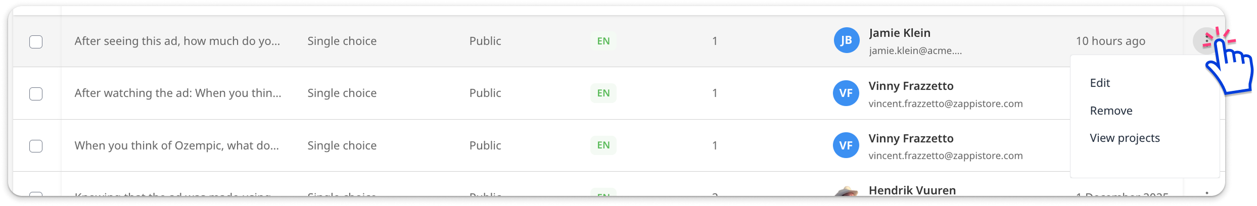 - Use the 3-dot menu to View the question details, Edit the name, or delete the question.