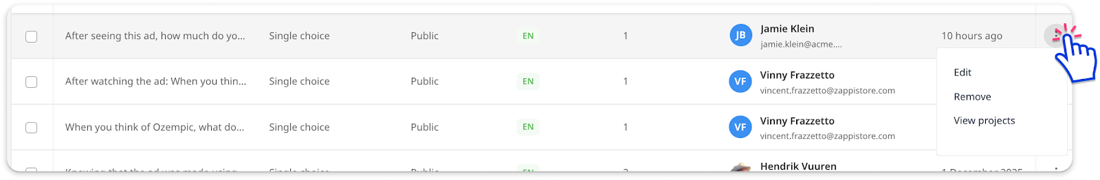 - Use the 3-dot menu to View the question details, Edit the name, or delete the question.