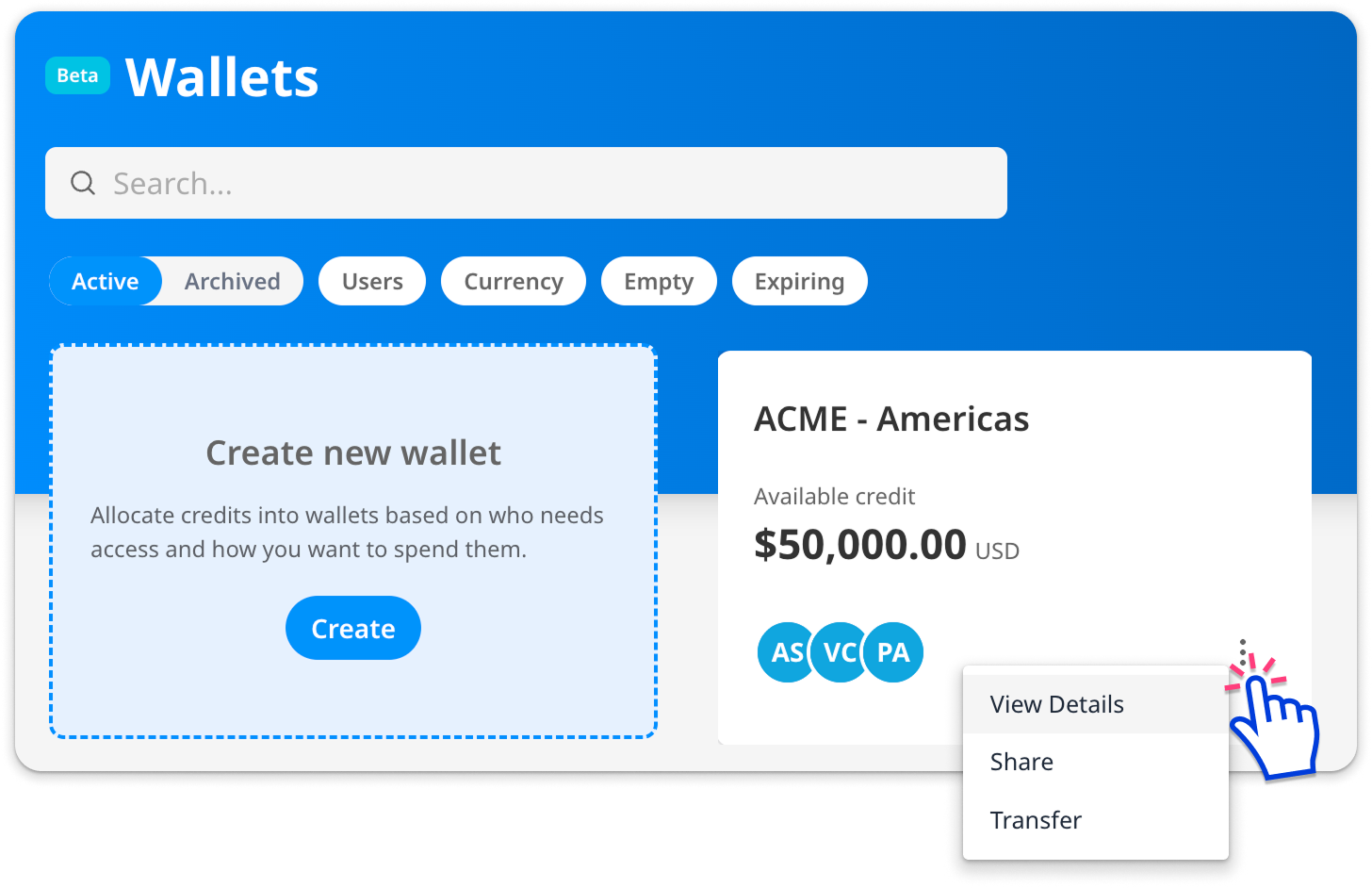 - You can find the transaction history for an individual wallet by clicking the 3-dot menu and selecting Details.