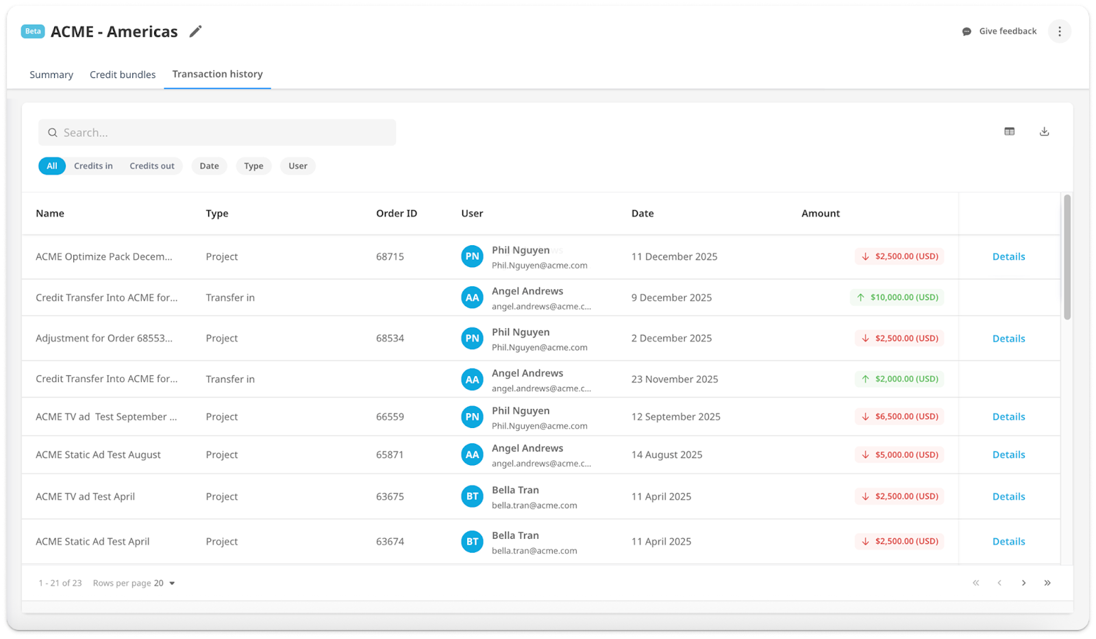 - You can find all transactions for your organization in the Transaction History section. Easily search by currency, user, transaction type, and more.