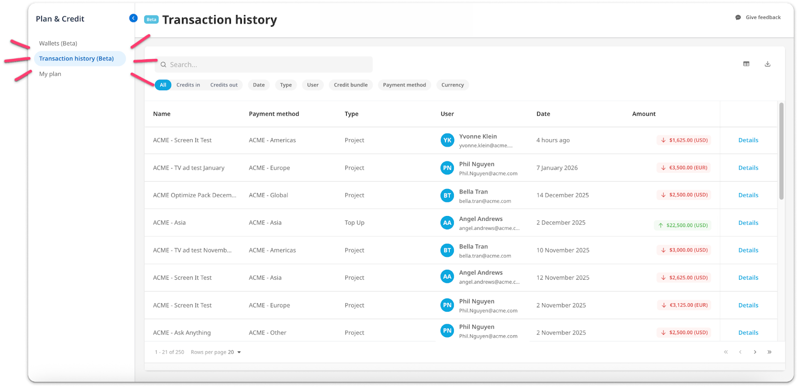 You can find all transactions for your organization in the Transaction History section. Easily search by currency, user, transaction type, and more.