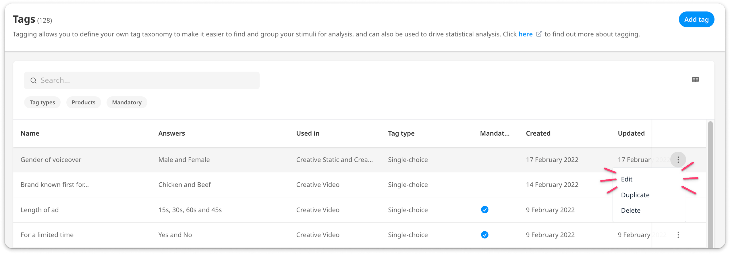 Tags are keywords or terms which are inputted during configuration to describe a piece of content. They are a great way to categorize your stimuli based on format, objective, content, brand, theme, or any attribute that you wish to test and compare.