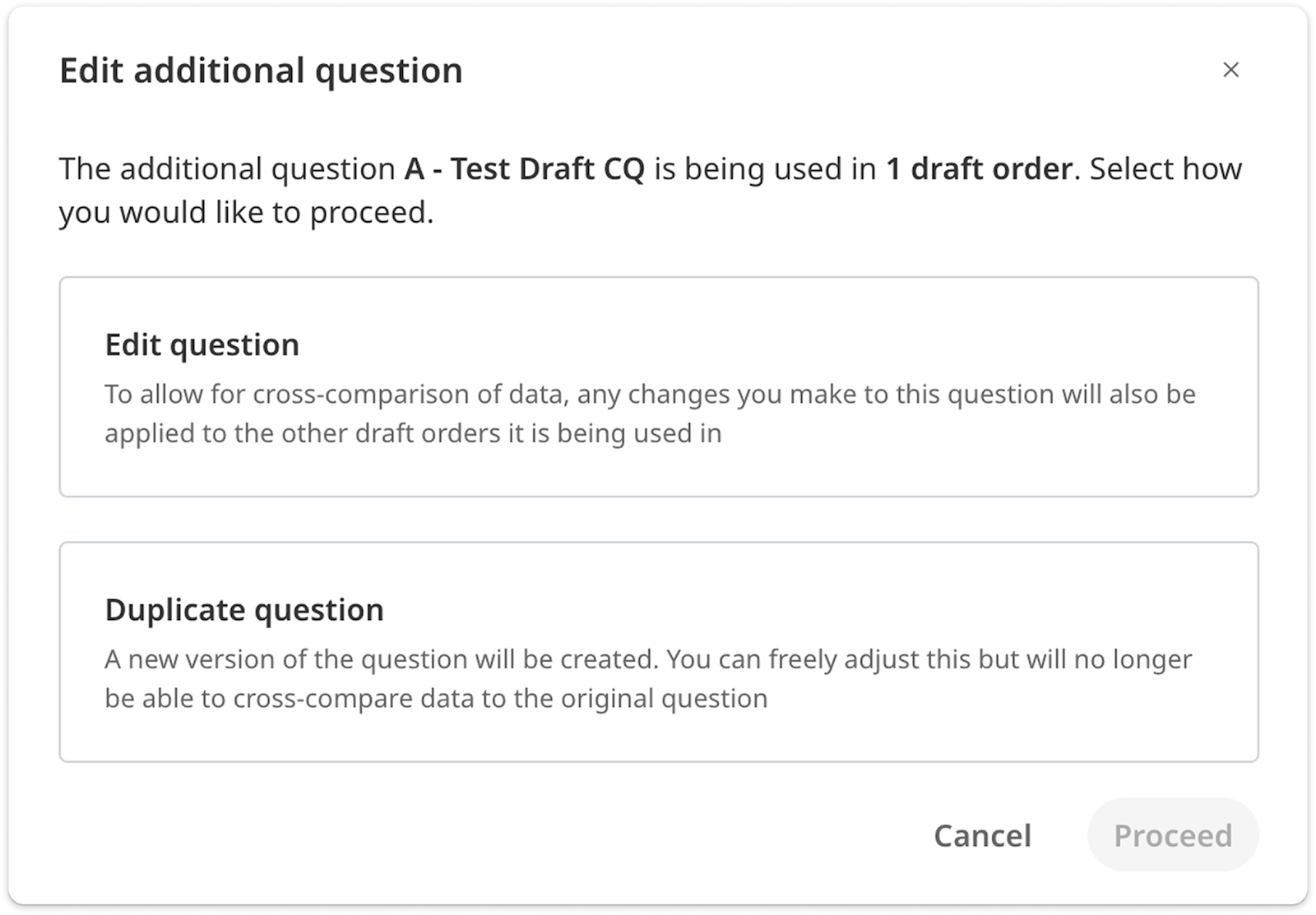 If you want to edit this new custom question, you can apply the edits to just this one question, or all other drafts of the same question, or even create a brand new question.