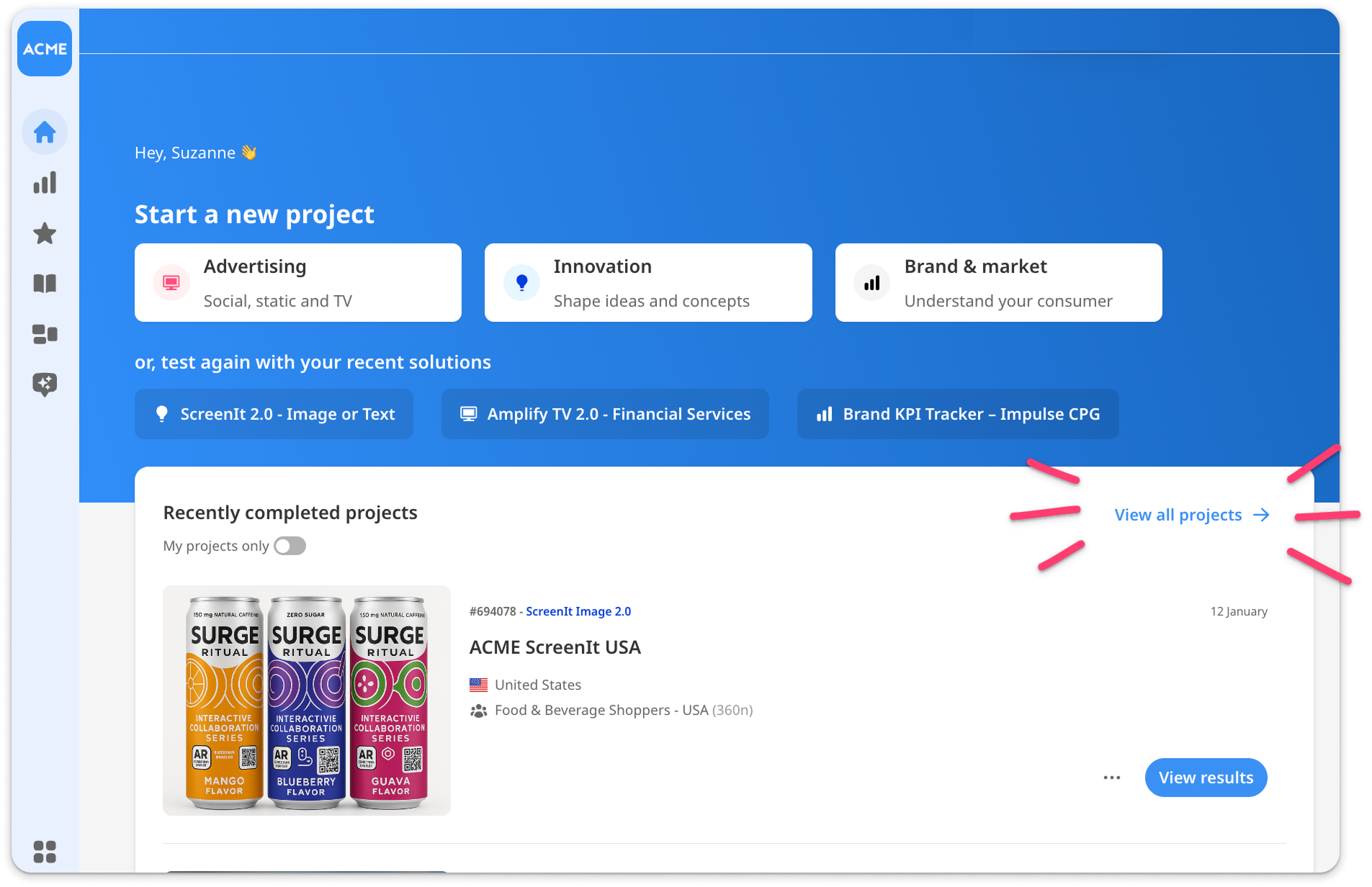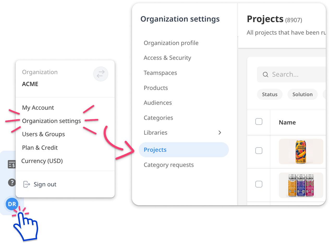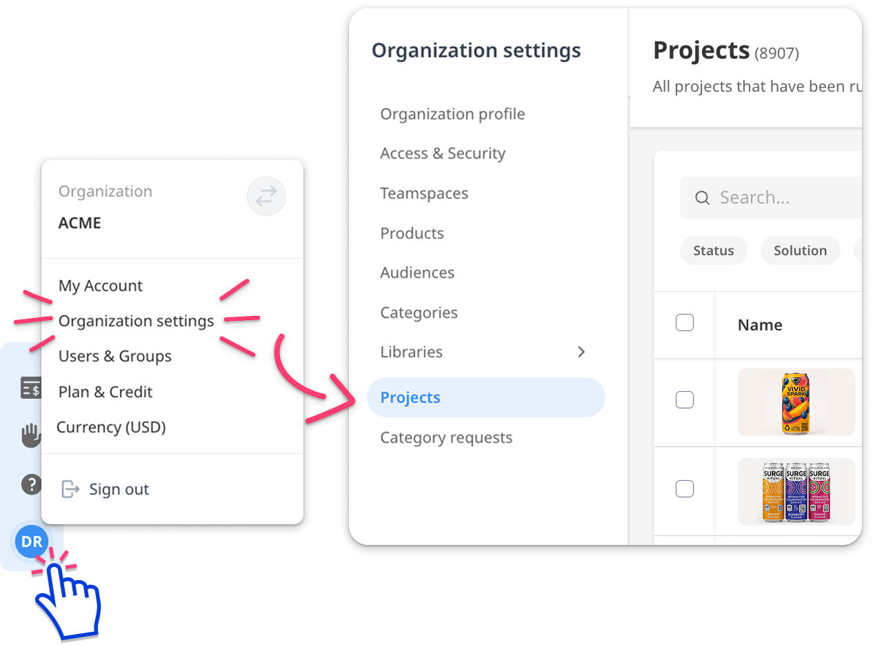 Start by navigating to the projects page by clicking ‘View all projects from the home page, or click your avatar in the bottom right, then select ‘Organization Settings’, and ‘Projects’.