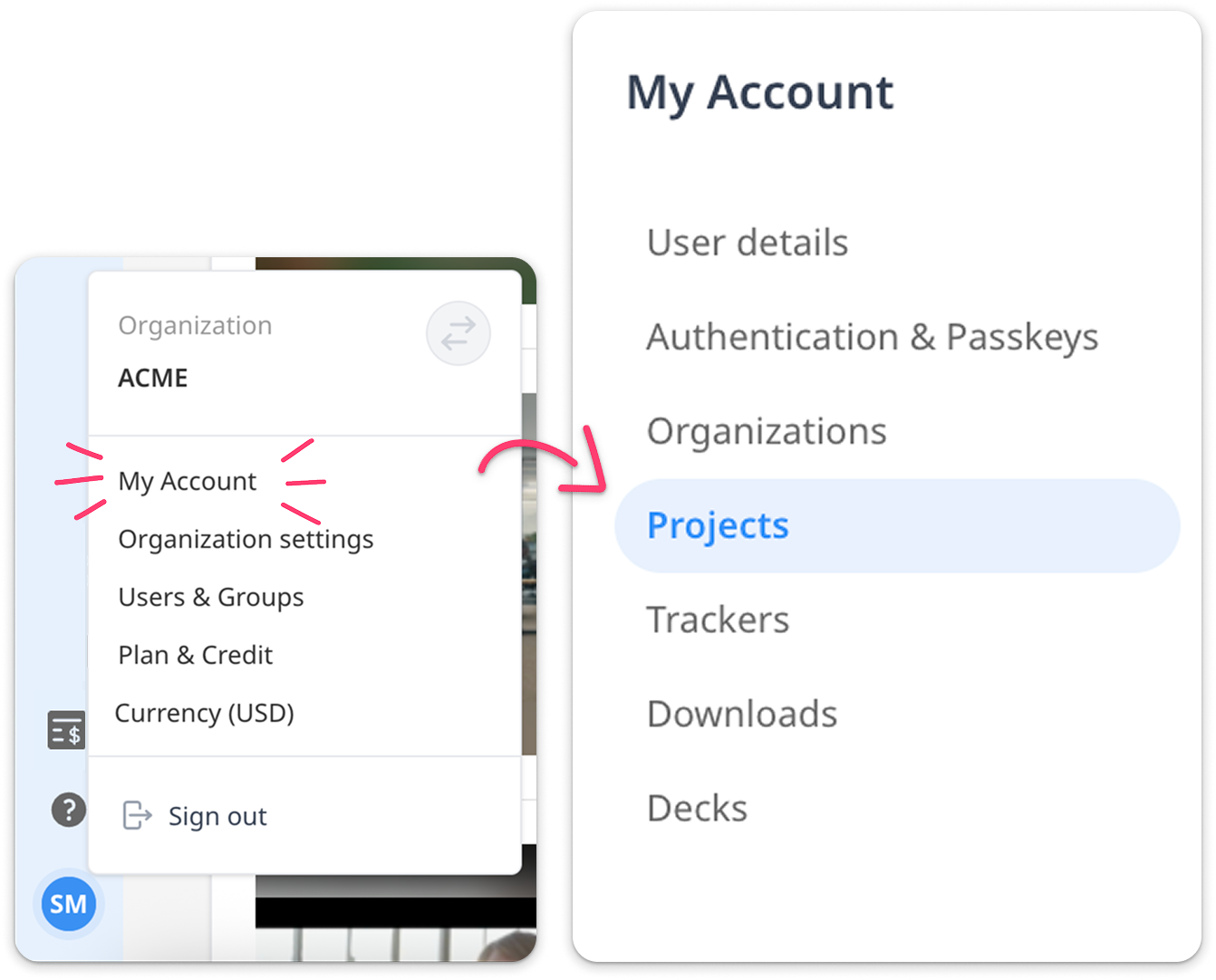 Click on your avatar at the bottom left of the screen, then click 'My Account' and choose 'Projects'.